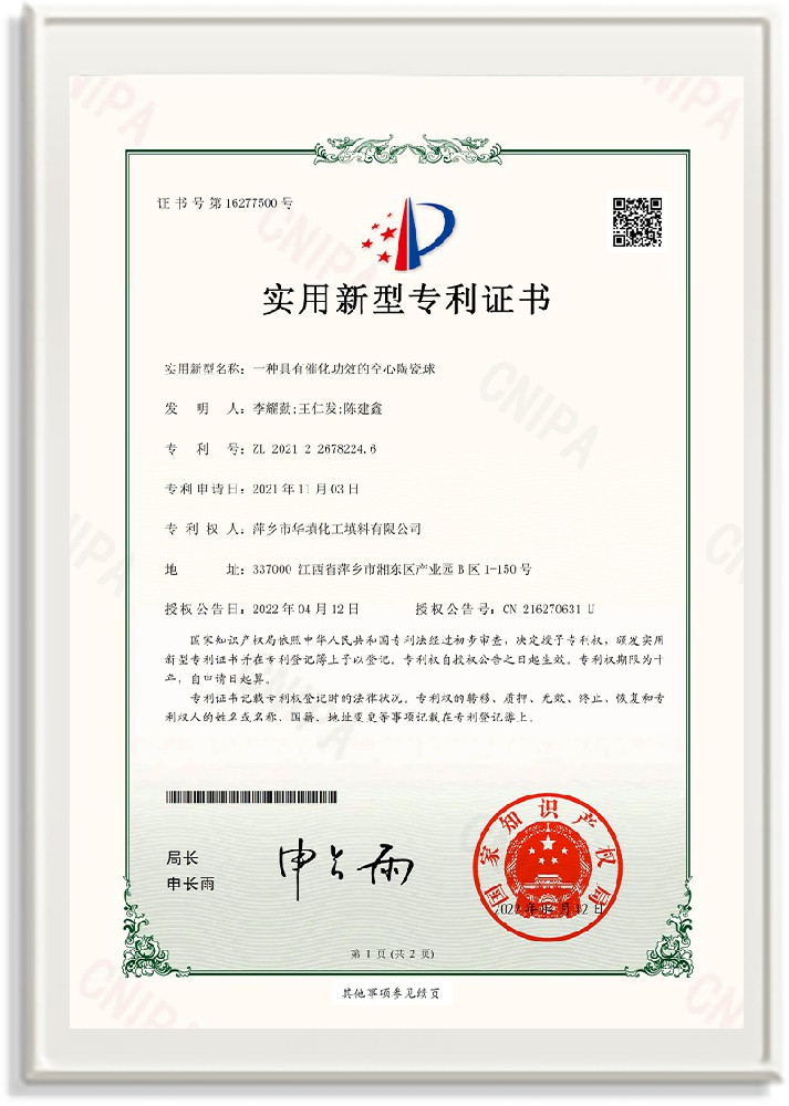 萍鄉市華填化工填料有限公司,位于320國道、109國道、浙贛鐵路、昌金高速公路貫穿其中,交通便利,是江西西部一顆燦爛明珠,創建于20世紀70年代初期,是中國石油天然氣股份有限公司“能源一號網”會員企業、中國石化物資采購電子商務網絡和中國海洋石油總公司采辦業務系統成員單位,是上海大學江西材料基因組工程產業研究院工業陶瓷產業創新聯盟基地,且通過ISO9001:2015質量管理體系、ISO14001:2015環境管理體系、ISO45001:2018職業健康安全管理體系認證的化工填料生產企業。公司擁有陶瓷、塑料、金屬填料、催化劑、活性氧化鋁、分子篩等產品生產線,現有固定資產3616萬元,占地面積3.8萬平方米。公司具有悠久的生產歷史、雄厚的技術力量和先進的生產工藝設備,可生產工業瓷球(支撐劑)、陶瓷、金屬、塑料質的規整、散堆化工填料及分子篩、催化劑、生化濾料、活性氧化鋁、石化助劑、活性炭、環保材料、耐火材料等系列的200多種規格型號產品。